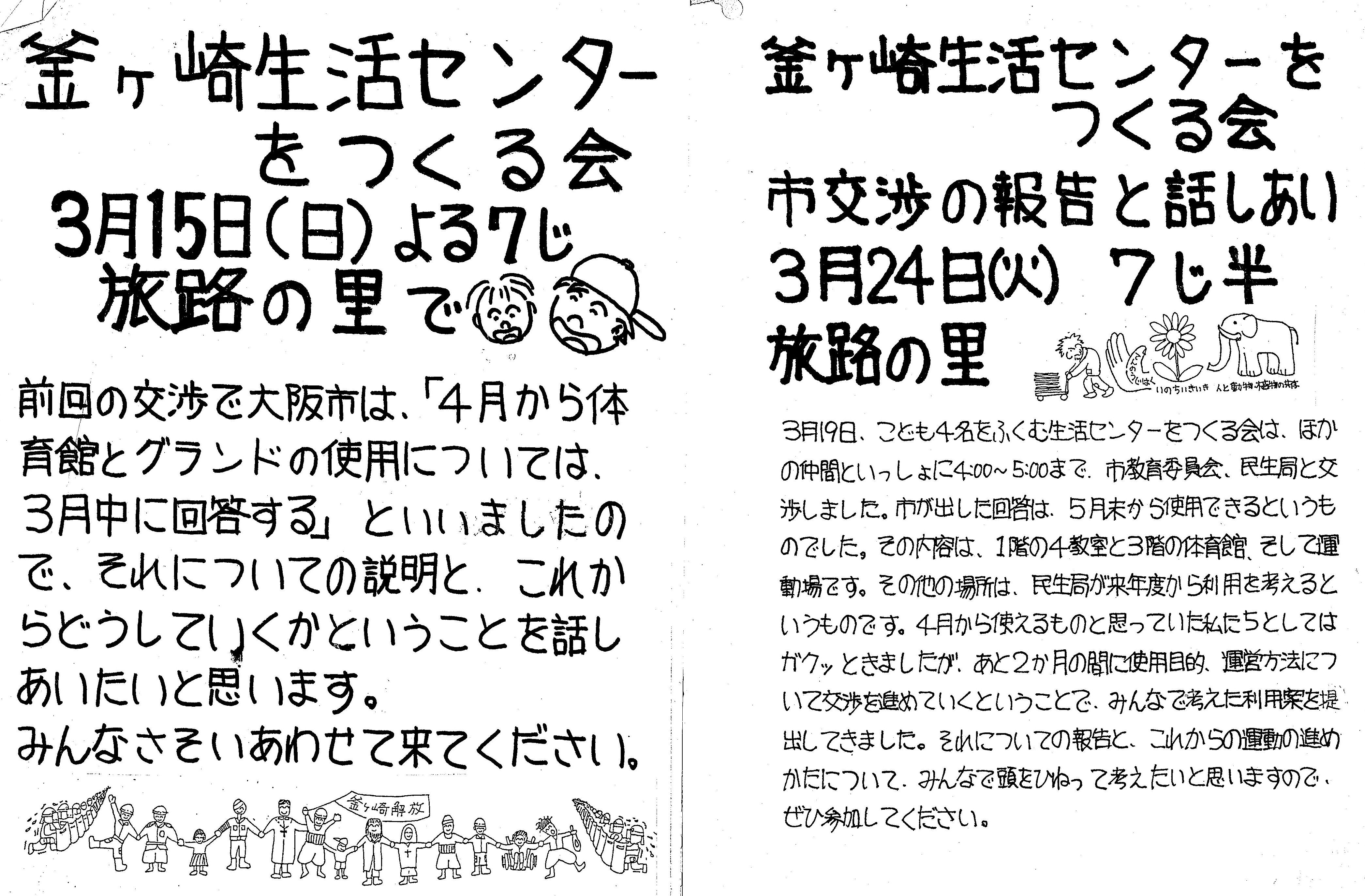 - 新今宮中・小学校の跡地を巡って/大人と子供のセンターとは(1984年7月6日・釜ヶ崎夜間学校ニュース=で、“会館設立運動がいましばらく道遠いとしても、その運動の主旨はあらゆるチャンスを利用して、広く訴え、部分的なものであれ実現をはかっていかなければならないと思います。/そのチャンスとして新今宮中・小学校の跡地利用をめぐる動きがあります。/新今宮中・小学校は釜ヶ崎の不就学・未就学児童のためにつくられたのですが、生徒がいなくなり、今年三月に廃校となって、現在は今宮中・萩之茶屋小学校の分校という形になっています。しかし、マンモス校でもないのに分校をつくったのですから、充分に活用される見込みはありません。そこで、−わしら日雇いにも使わせろという要求を出そうという話があります。それについて考えてみましょう。