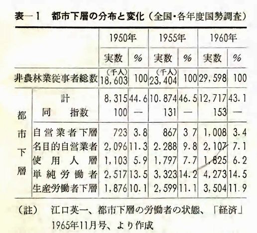 不良住宅居住を生み出すもとになるのは生活の貧困化であるが、貧困が集中的に顕在化する層としての都市下層の動向をみれば、近年その絶対量が増大していることが指摘できる、例えば、江口英一氏は、非農林業職種従事者を都市的就業者とし、そのうち、「自営業者」中の建設職人・手工業者、「名目的自営業老」(行商・露天商・家内労働者等)、「単純労働者」、「生産労働者」中の下層をもって、<都市下層>と定義しているが、表-1に示す通り、その種総数は、1955年の10,874千人から、1960年の12,717千人と200万人の増加となっており、1950年の都市的就榮者数の43%に及んでいる。一方、「生産労働者」中の中・上層も大巾に増大しているが、それらは全体的にみて、都市下層の比率を減少させることなく、むしろその基礎の上に拡大していることが問題である。そして技術革新の進行過程では、若年労働者層の半技能労働者化と対比的に、都市下層の不熟練労働者化が進み、特に中高年令層の雑役人夫層を多量に産み出している。(註江口英一、都下々層の労働者の状態,「経済」1965年11月号)