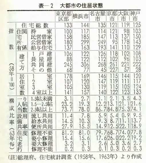 都市上層の住居状態は持家のデラックス化などによって改善されていっているが、下層のそれは依然低い状態に取りのこされており、全体として都市の住居状態は停滞的である。総理府住宅統計調査によって、1958年と1963年両年間の6大都市の住宅事†青の変化をみれば、表-2の如くである。まず、住宅総数では各市20-40%増となっている、所有関係別にみれば、「民間借家」の増加が著しい。建て方では「共同建」の増加が各市とも2.5~3倍と顕著であるが、その主体は<木造アパート>にあるとみられる。居住室数では、「1室」と「4室以上」の増加が目立っているが、前者は木造アパートによるもの、後者は持家によるものと推定され、絶対量では「1室」の増加量が大きい。63年の居住室数分布は、各市ほぼ40~50%である(表-略)、規模からいって住居状態は依然悪いのである。1人当り帖数の指数は、「2.5帖以下」においていずれも減少しているが、これは、居住室数の変化からみても、供給住宅の規模拡大の結果とは言い難く、むしろ世帯規模の縮少化の寄与している面が大きいと考えられる。設備については、流し、給水、便所の共用はいずれも滅少しておらず、特に便所の共用は、まだ約2割も存在している。以上からみて、6大都市の住居状態は、停滞乃至は悪化していることは明らかである。そして、これら都市住居の質的状態の悪化を規定しているのは、<木造アパート>群の存在であるといえよう。木造アパートの立地状況、集団化形態は極めて劣悪であるから、不良住宅地区の再生産要因になるものとして地区改良の観点からとらえることが必要となってきているといえよう。