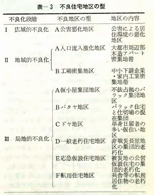 これら地域の悪化要因の考察に基ずいて、不良住宅地区の型分けをすれば、ほぼ表-3に示す如くである。不良性の内容、あらわれ方の範囲といった点からみて、不良住宅地区の型は極めて多岐にわたっている。(もちろんこのような型分けは、不良化形態を単純化して示したものであり、実際にはこれらが複合してあらわれる。)悪化現象が段階的にあらわれていることを注日しなければならない。さらに、この類型化は、悪化の物理的側面のみをとりあげているが、住宅・地区の不良化の背後には、住民の貧困問題が存在していることを考え合せるべきである。