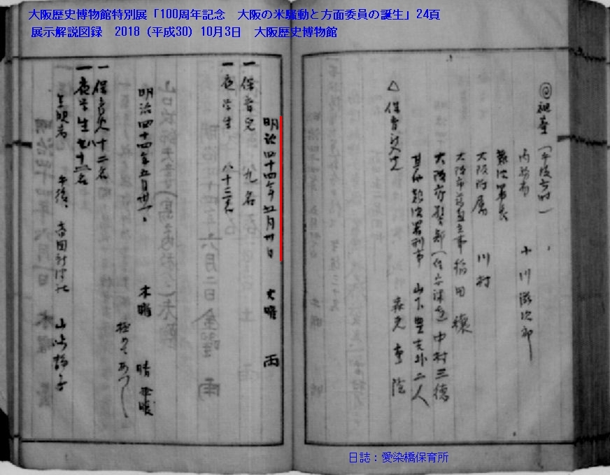 それらを踏まえた上で、飯田直樹は、自分なりに年月日を特定しようと努めたようである。しかし、特定し得る資料に出会えず、別に入手した「愛染橋保育所日誌」に記載されている視察記事(明治44年5月29日)を傍証に、自彊館開設のきっかけとなった視察も同時期にあったとしている(展示解説図録183頁=aizenbasi-44.jpg=)。
