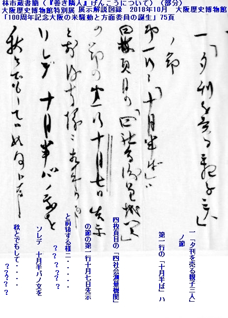 『大正7年10月7日という「方面委員規定が大阪府告示第255号をもって制定された」日付けと、同年10月9日という「夕刊売り母子の件が知事の指示によって当時の淀屋橋派出所の巡査七藤健之助が、上司に復命した」日付けである。この二つの日付けの出来事に関して、当の大阪府知事林市蔵が10月9日の、淀屋橋派出所の復命という出来事を10月7日の、方面委員規程制定の動機として説明しており、その説明の仕方をそれから半世紀後に「大阪市方面委員民生委員創度五十年史」は「期日の違いということがあっても、この(母子の夕刊売りの-小野補)挿話の真実柱に対しては、五十年余も以前のことで今さらそのことに、疑義をはさむこともないとおもわれる。/済生(ママ)顧問は済生(ママ)顧問であり、方面委員は方面委員である。といわれるように、真実は真実である。」と述べ、林市蔵による五十年前の説明の仕方に疑義を投げ掛けることにむしろ反発を示し、そのまま受け入れようとしている。方面委員の任務を理解してもらうためにはまさに《打ってつけ》なりと林自身がおそらく膝を叩いて採用した、街頭で夕刊を売るみすぼらしい母子という事例は、他人ではなくまさに林が遭遇したものであったことは間違いなくとも、そのことを動機と結果という歴史的説明のなかに持ち込むことは、批判されねばなるまい。