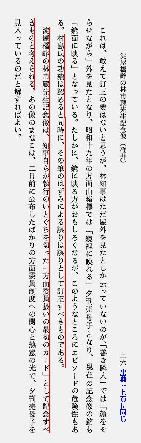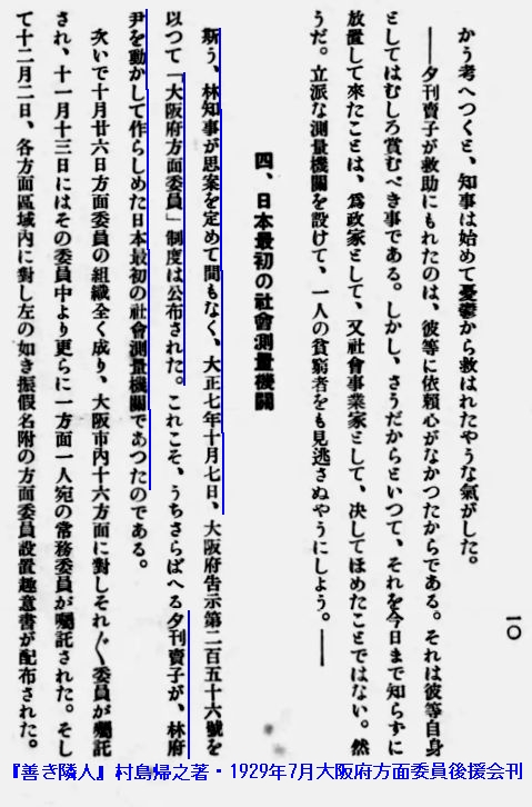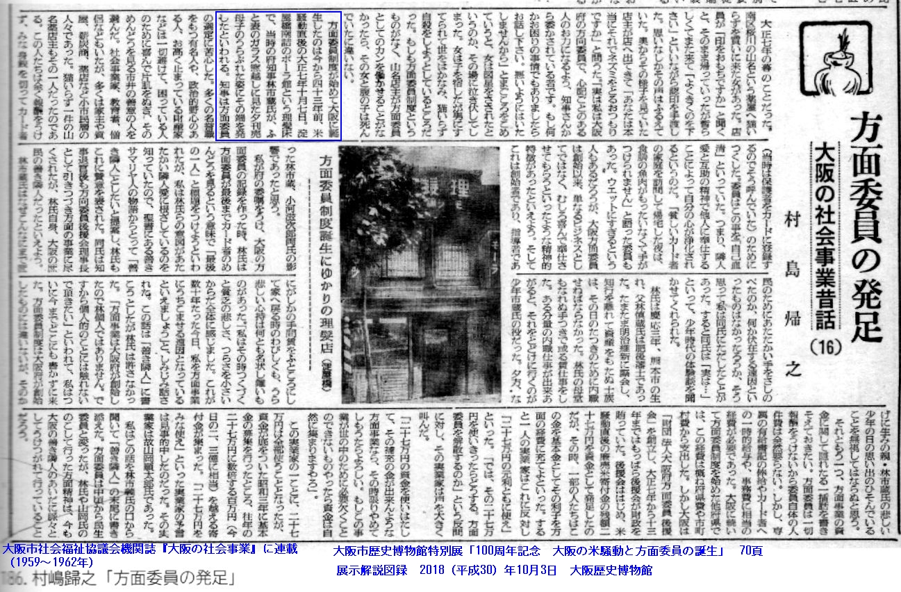 『誤りの文章上の最初、またそれを広めたと思われるのは、村島帰之『善き隣人-方面委員の足跡-』(昭和4年)である。-方面委員の認識を広めた功績ははなはだ大きい。-あえて誤り伝えるほどの意志はなかったと思うが、このエピソードでは、林知事が夕刊売り家庭の悲惨に感じて方面委員制度を創案したことになっている。-村島氏の功績は認めると同時に、その筆のはずみによる誤りは誤りとして訂正すべきものである。』=usui-3.jpg=/rinjin-1.jpg=rinjin-2.jpg=houmen-1b.jpg=