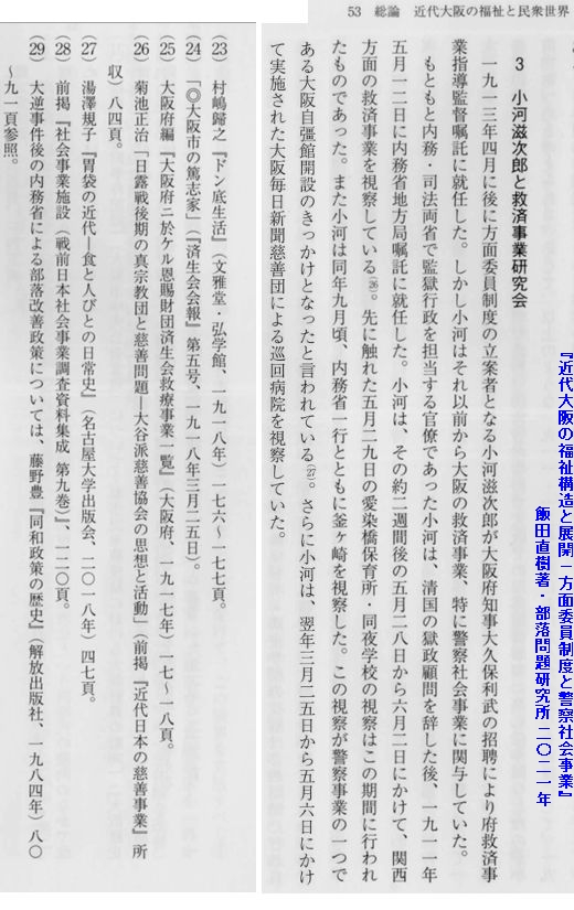 『内務・司法両省で監獄行政を担当する官僚であった小河は、清国の獄政顧問を辞した後、1911年5月12日に内務省嘱託に就任した。小河は、その二週間後の5月28日から6月2日にかけて、関西方面の救済事業を視察している。(注26)先に触れた5月29日の愛染橋保育所・同夜学校の視察はこの期聞に行われたものであった。また小河は同年9月頃、内務省一行とともに釜ヶ崎を視察した。この視察が警察事業の一つである大阪自彊館のきっかけとなったと言われている(注27)。』=iida-1.jpg=