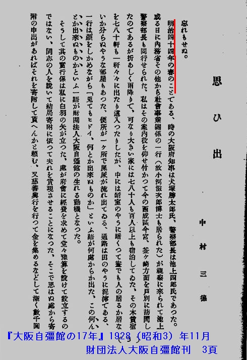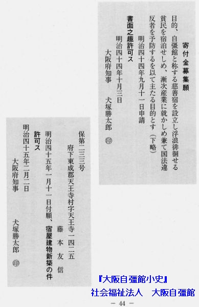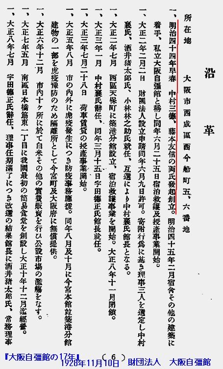 大阪自彊館の方はどうかというと、『明治44年早春 中村三徳、藤本友信の両氏発起設立。明治45年2月宿舎その他の建築に着手、私立大阪自彊館と称し同年6月25日宿泊救護及授産事業開始。』(『大阪自彊館の17年』6頁「沿革」)