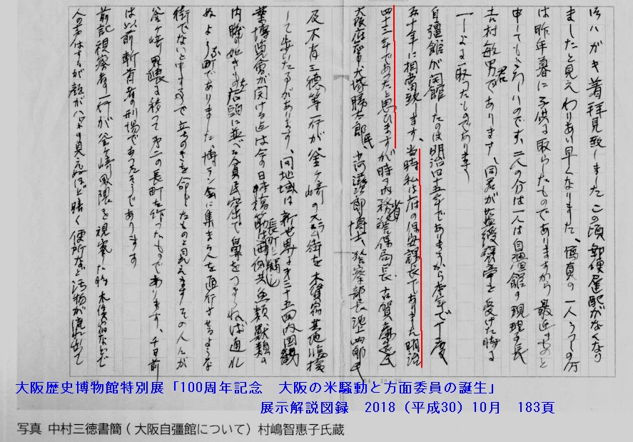 先に紹介した大阪歴史博物館展示解説図録の資料編183頁に、中村三徳から村島帰之への返信が紹介されているが、視察の時期について、「明治44年」でなく、「明治43年」と書いている=jikyou-chu-1b.jpg=。それにゆえに村島は「確かな月日は判明しない」としたのであろう。