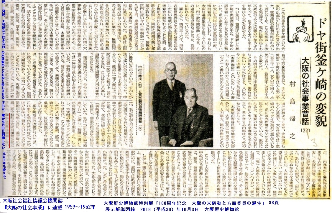 『大阪歴史博物館特別展「百周年記念 大阪の米騒動と方面委員の誕生」展示解説図録』(飯田直樹・2018年10月、大阪歴史博物館刊)の38頁に紹介されている、『ドヤ街釜ヶ崎の変貌』の中で、村島帰之は、視察の時期について「確かな月日は判明しない」と記している。(『ドヤ街釜ヶ崎の変貌』=jikyou-chu-2a.jpg=は、大阪社会福祉協議会機関紙『大阪の社会事業』に1959~1962年にかけて村島帰之が連載した「大阪の社会事業昔話」の22回目の題名。『展示解説図録』では、掲載機関紙を写真製版したものを印刷掲載している。)