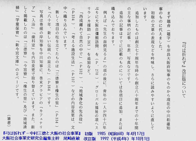 『弓は折れず』には初版以外に、「改訂版」(1992年10月)と改訂板を復刻した「複刻版」(2016年12月)がある。著者による「改訂板について」によれば、改訂したのは、①題字を現在の大阪府知事のものに変えた②文章を読みやすいように直した。③70周年以降の10年間の主な事柄の記事・年表・写真などを追加した、であり、初稿内容に大きな変更はないようである。今回の引用は特に断らない限り初版による。=kaiteiban-1a.ipg=