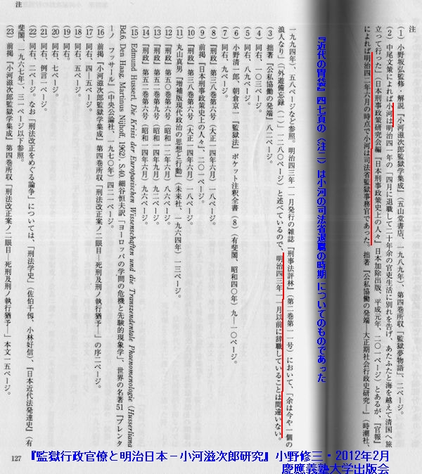 湯澤が参照した小野の本の当該部分(127頁)は、小河の司法省退職の時期についてであり、視察時の様子などについては、『大阪自彊館百年のあゆみ』によったもののようである。『大阪自彊館百年のあゆみ』の記述と小野修三の示す小河滋次郞の履歴からして、視察はこの時期としか考えられないということであるのかも知れない。