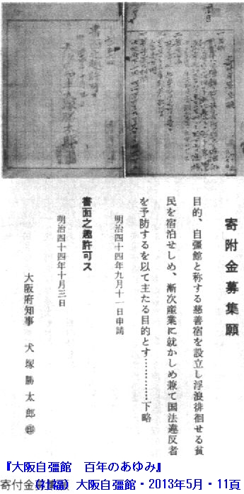 目的 自彊館と称する慈善宿を設立し浮浪徘徊せる貧民を宿泊せしめ、漸次産業に就かしめ兼ねて国法違反者を予防するを以て主たる目的とす」(『大阪自彊館百年のあゆみ』2013年・11頁写真説明)=kifukin-bosyu1.jpg=