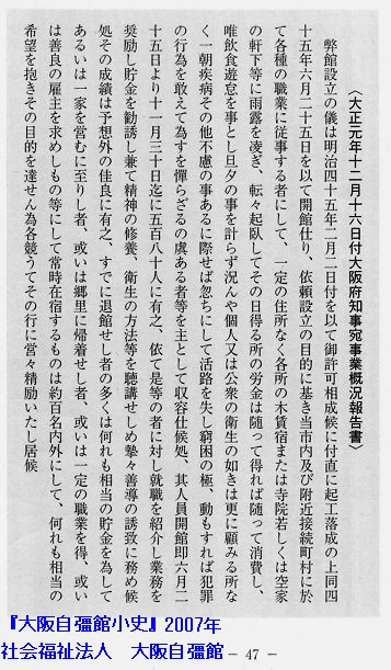 『大阪市に於て常時最もドン底生活者の集窟ともいはれる、釜ケ崎附近はこれ等落伍者の聚落地であり、その日常生活は全然不規律無節制で、取分け是等の人達が起臥する多数の木賃宿の光景は、真に汚穢そのもののやうな状態であつて、兎ても人間の這入るやうな所ではなかつたのであった。/斯したやうな暗黒街の真ん中に本館は出来た、いふまでもなく、人生に希望を抛棄した人々、若くは頭を擡(もた)げんとしても、金槌の川流れのやうに浮む瀬のない人々のために、甦生の大精神を鼓吹し、飢へた者には糧を與へ、徒食の者には職を授け、或は疾病を治癒して、活社会に送り出し、更に進んでは環境浄化の大旗をかざして、こうした方面の改善を企画したことは、慥かに世人から驚きの眼を以て見られたのであつた。』(『大阪自彊館の17年』11頁)