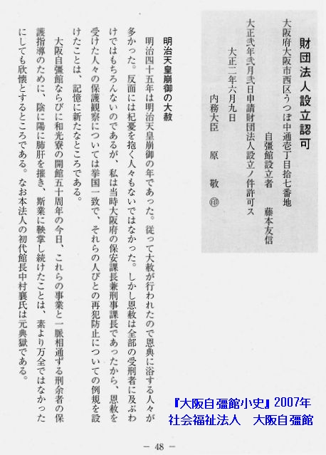 『大阪自彊館小史』(大阪自彊館・2007年1月・48頁)において、中村三徳は、「明治天皇崩御と大赦」の項で刑余者の保護事業に就いて触れている。=syousi-4.jpg=