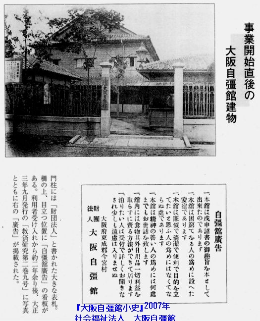 『私立大阪自彊館と称し同年(明治45年)六月二十五日宿泊救護及び授産事業開始。』(『大阪自彊館の17年』「沿革」)