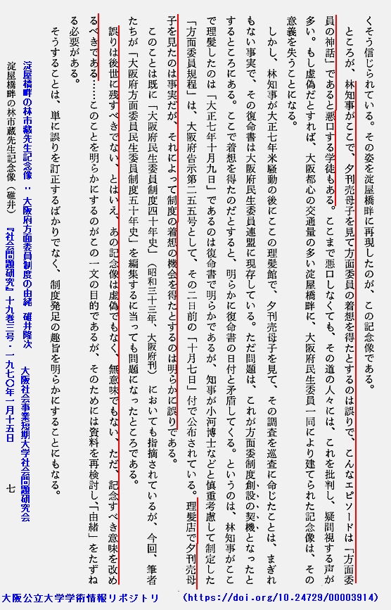 『(林知事が)理髪店で夕刊売母子を見たのは事実だが、それによって制度の着想の機会を得たとするのは明らかに誤りである。/-/誤りは後世に残すべきではない、とはいえ、あの記念像(淀屋橋畔の林市蔵先生記念像)は虚偽でもなく、無意味でもない、ただ、記念すべき意味を改めるべきである』=usui-1.jpg=