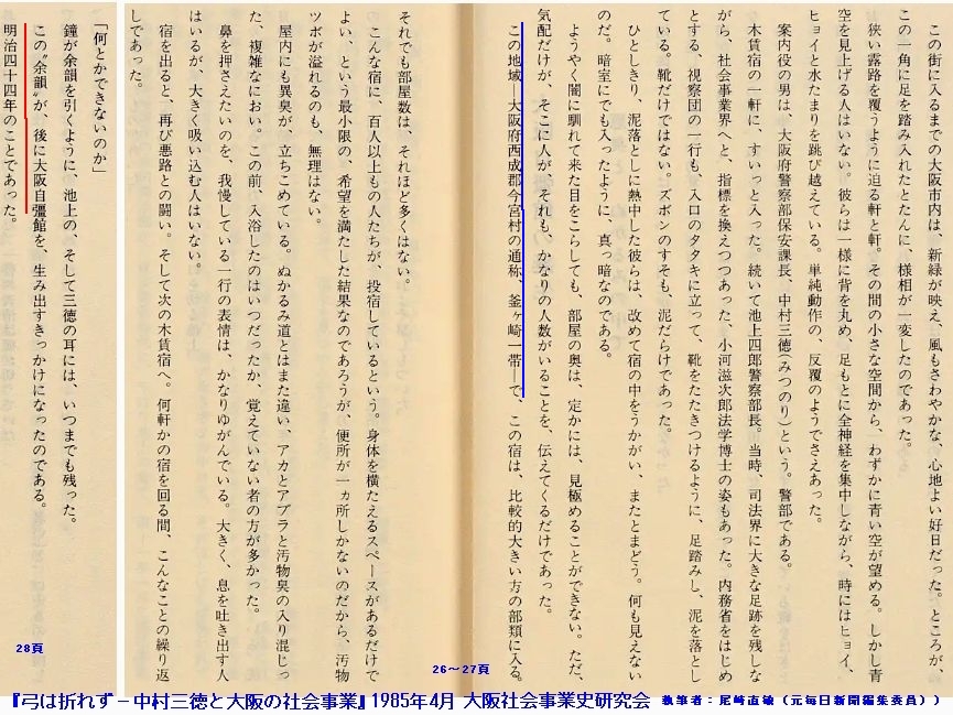 (一つの事例。『弓は折れず』54頁に「大阪自彊館昭和8年度第23次 事業報告書はしがき」の記述からの引用風に、『同村(今宮村)は百余戸の大小木賃宿が軒を並べて太陽なき室、汚物の流れ出た便所、雨天にはいつも通路と下水とが合同する。』との記述がある。第五回内国勧業博覧会開催は明治36年3月からで、その開催準備の影響(長町の裏長屋の今宮村・釜ヶ崎への移転)を述べている箇所だが、この記述を視察の情景の膨らましに、三徳の「思ひ出」とは別に参照したと思われる。)